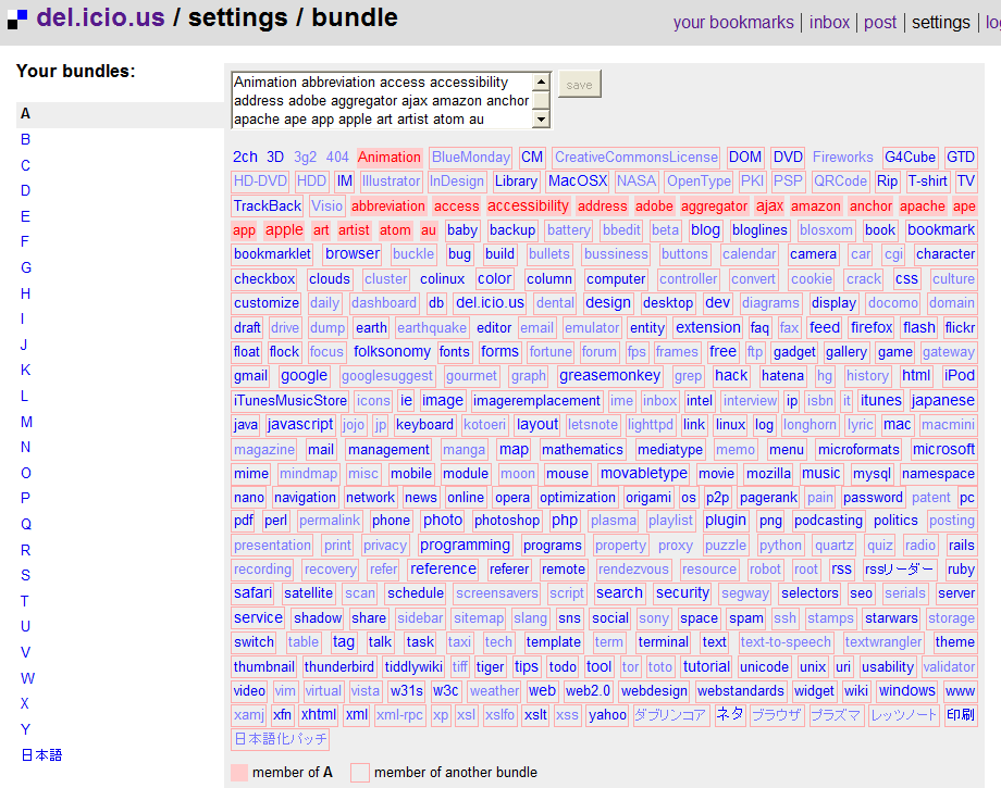 ソーシャルブックマーク del.icio.us の settings にある tag bundles の設定方法が変更されている。前までは非常に設定しづらかったんだけど、今回の変更でかなり設定しやすくなった。
