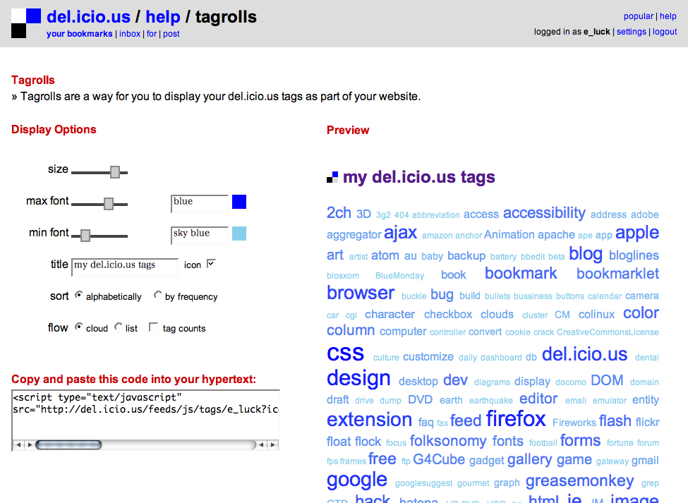 そんな help ページで見つけた、面白そうなもんが Blog Integration 欄にある Tag rolls ってやつ。自分の tag 一覧を自サイトに表示するためのスクリプトを生成することが可能になっている。