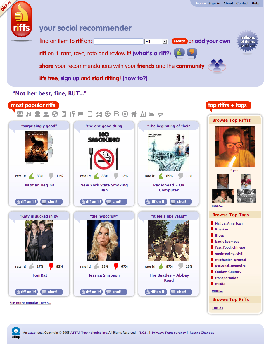 レコメンドされたものは、Riffrs と呼ばれるユーザがレビューや評価をする。レコメンドされている物の詳細情報は誰でも edit できたり、簡単なチャット機能なんかもついてたりする。もちろん RSS が用意されていて、注目しているものは最新の情報を受け取ることも出来るみたい。自分の感覚に近い Riffrs をお気に入りとして、その Riffrs が今なにをレビューしているのかチェックできたりとまさにソーシャルっすよ。まだ、Alpha なんで今後のブラッシュアップが期待できそう。