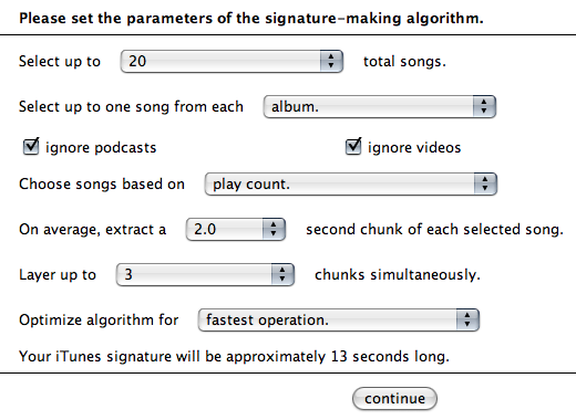 iTunes のミュージックライブラリを利用して、再生回数や割り当てたレイトなどの情報からその人の好みの曲を抽出してオーディオ署名を作成してくれる iTunes Signature Maker ってのがあるんだけど、試しに作成してみたら超イントロクイズドレミファドン!なミキシングぶりに軽くのけぞった。